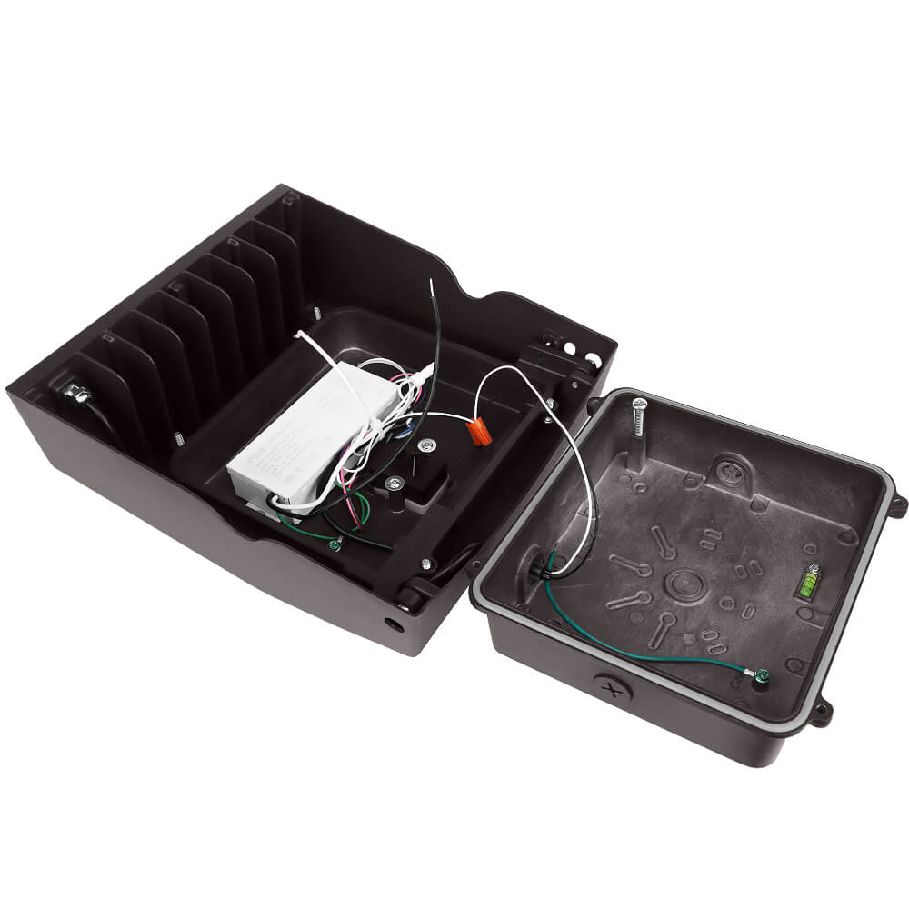 The Konlite Adjustable Full Cutoff LED Wall Pack pairs a low-profile architectural form with bright, energy-efficient performance. Its rugged bronze aluminum housing offers multi-mount flexibility and a heavy-duty spring-loaded hinge (0° to +90°) for precise forward throw or site-line focusing. A UV-coated flat lens delivers uniform illumination with excellent glare control. Fully sealed to IP65, UL listed, DLC Premium, and backed by a 5-year warranty.