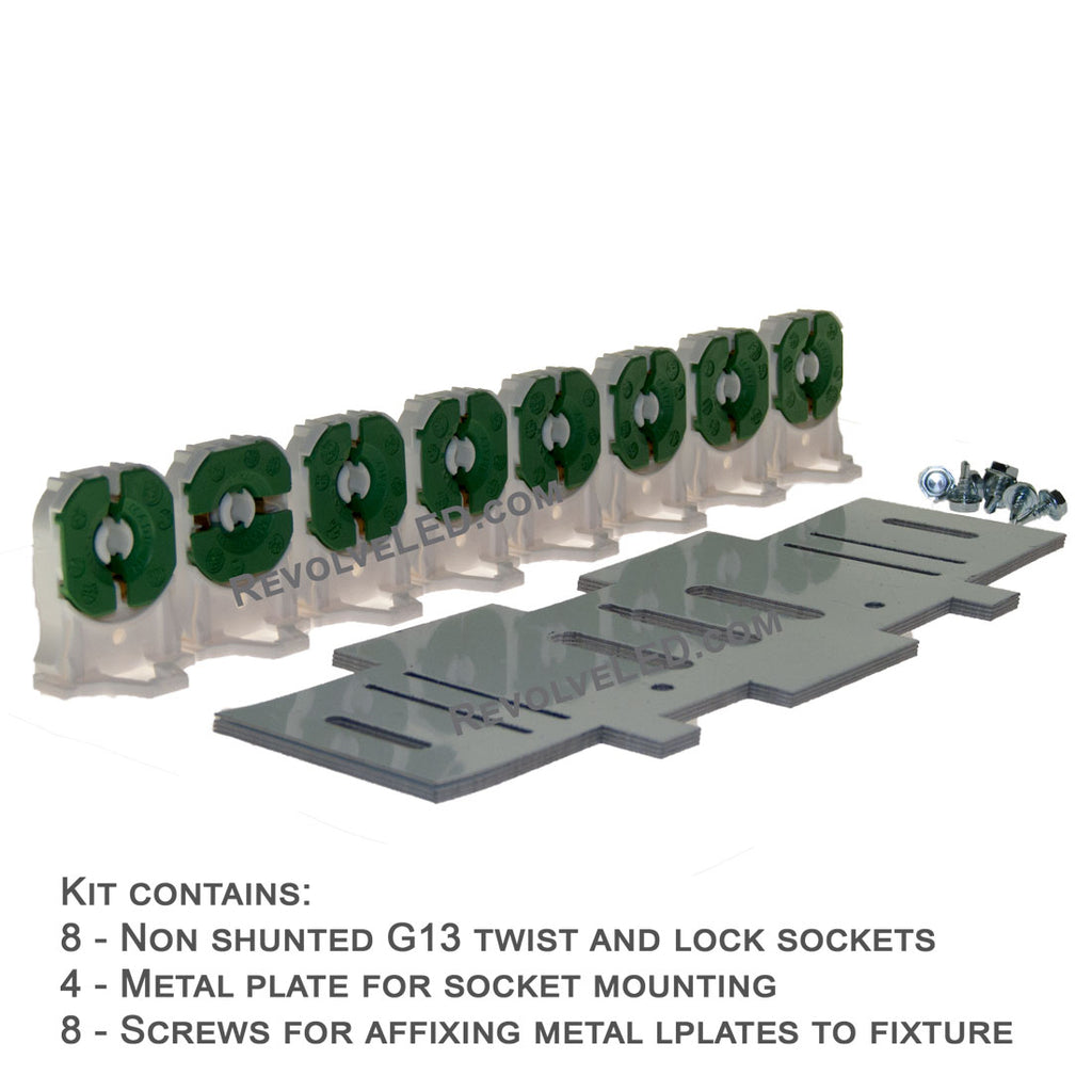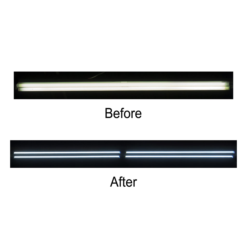 Fluorescent strip fixture retrofit kit for LED. Changes from 2 8 foot tubes to 2 or 4 four foot LED Single End T8 tubes.